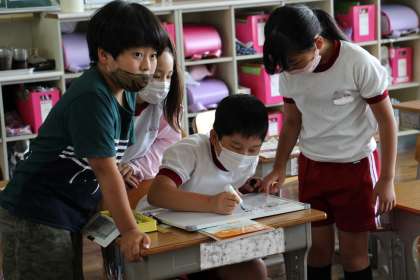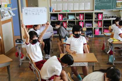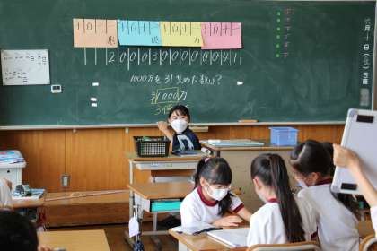 4年生算数 公開日 2022/06/10 更新日 2022/06/10 お知らせ 4年生の算数「1億をこえる数」の授業の様子をお知らせします。 「1000万が542個と10万が94個、1000が101個の数はいくつ?」といった問題を、グループで相談してホワイトボードに書き、班別対抗戦を行いました。 白熱した計算バトルが繰り広げられました。