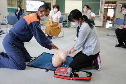 午後の時間には、水泳学習を来週に控え、職員救急救命講習を行いました。心肺蘇生法とAEDの使い方を、消防署員に学びました。
