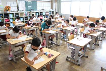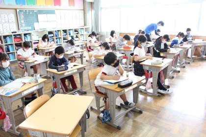 今日の各学年の授業の様子をお知らせします。5年生は、算数の「小数の割り算」の学習です。