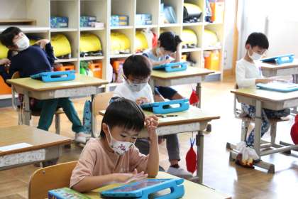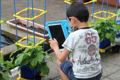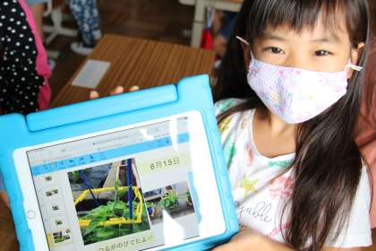 生活科で育てている植物の観察日記を、タブレットを使って行っています。写真やその時の様子を簡単に記録していますが、生長の様子がよくわかります。