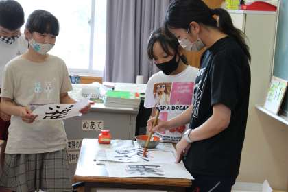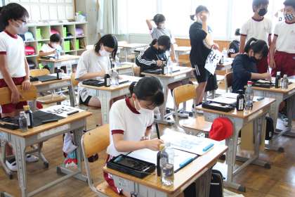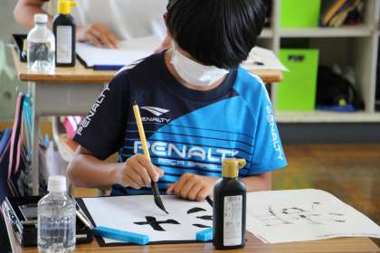 6年生の書写の授業についてお知らせします。本時は「湖」という字を書きました。画数が多く、とめ、はね、払いを含んだ漢字で、バランスも大切です。担任の指導を受けながら、より美しい字を書いていました。