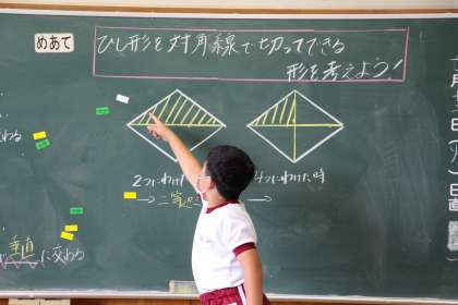 4年生算数 公開日 2022/07/12 更新日 2022/07/12 お知らせ 4年生の算数「ひし形の対角線でできる形」の様子をお知らせします。 図形の問題は、理由や説明が必要となることが多く、苦手意識をもちやすい単元です。今年度の本校の重点の「理由や根拠をもって、自分の意見を伝える」活動を通して、どんどんお利口になってほしいと思います。