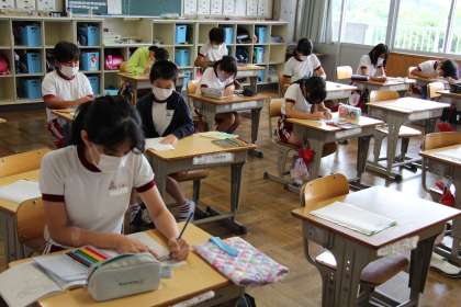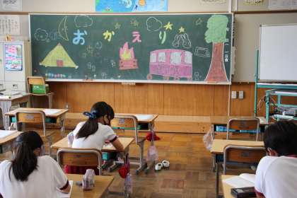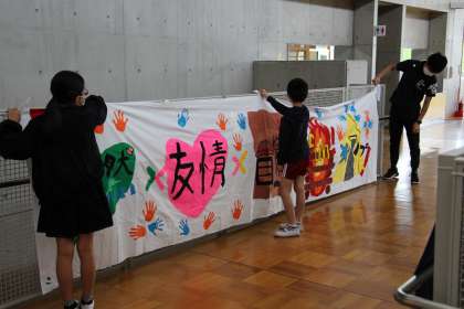 キャンプ明けの初登校日でしたが、体調不良で欠席する子もいました。キャンプの振り返りや、学級皆で作った旗を教室前に掲げるなど、キャンプで培ったことを、次の生活に向けて生かせるようにスタートしました。