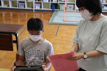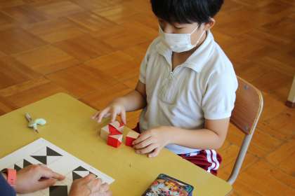 あすくす学級の授業 公開日 2022/09/05 更新日 2022/09/05 お知らせ あすくす学級の授業の様子をお知らせします。あすなろ学級は、道具を使った学びです。印が書かれた積み木を示されたように並べる学習と、写真ではわかりにくいですが、回転させるとセミやカエルの鳴き声がする玩具を使っての学びです。 くすのき学級は、ブロックの交流会に向けて、進行のリハーサルを行いました。