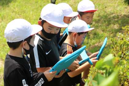9月になりましたが、まだまだ暑い日が続いており、常時暑さ指数計とにらめっこしながら、子どもたちの活動の可否を判断しています。本時もご覧の通り、ギリギリ学習ができる範囲でしたが、充分な水分補給が必要な天候でした。