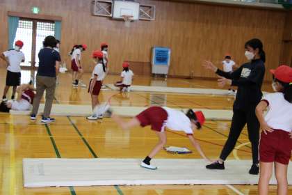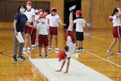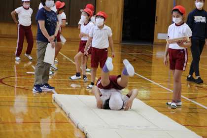 4年生の体育「マット運動」の授業の様子をお知らせします。発表会も近づき、自分の演技をバディに見てもらい、アドバイスをし合いました。