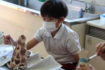 あすなろ学級の授業の様子をお知らせします。1枚目の写真は、交流の図工「陶芸作品の絵付け」の様子です。
