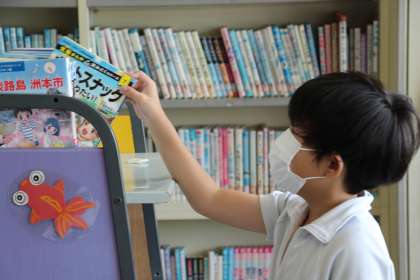 2枚目は、図書館での本探しの様子です。本日来校していた学校図書館司書にアドバイスをもらいながら選びました。3枚目は、図書館に展示されていた「月」に関する本の紹介でした。まだこれからも「名月」を味わうことができるようです。