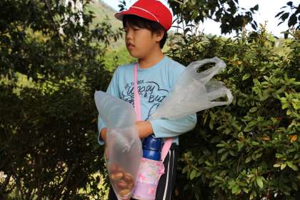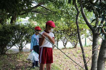 校内に実っている栗の収穫です。棒などを使っていがを落とし、中からぷりぷりに実った栗を取り出しました。この栗は、調理実習等を行い、「ごちそう」に変身させる予定です。