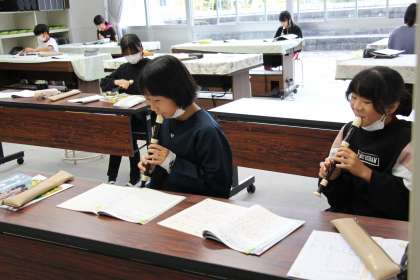 6年生の音楽と外国語の授業の様子をお知らせします。音楽は、リコーダー演奏の様子です。