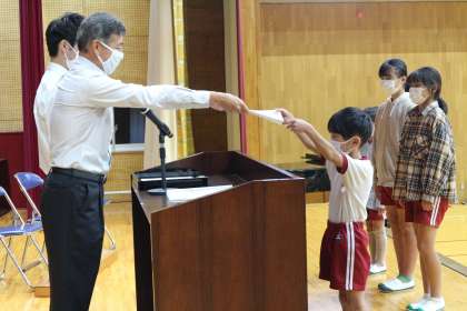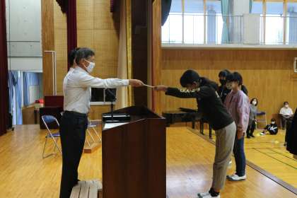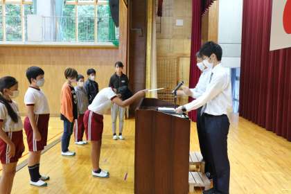 学期区切り式 公開日 2022/10/07 更新日 2022/10/07 お知らせ 本日をもって前期が終了し、10/11(火)から後期がスタートします。そこで、本日の5時間目に「学期区切り式」を行いました。 まず、式に先立って行った学級委員等の任命と各種表彰の様子をお知らせします。