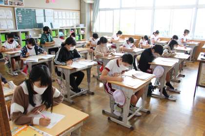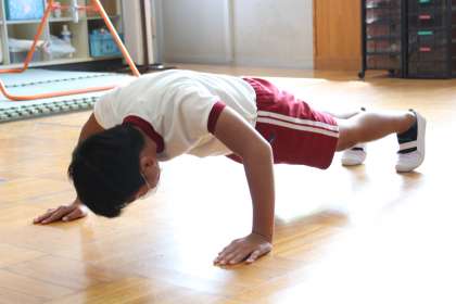 6年生は、修学旅行を楽しめるように、行く前に単元テストを行いました。くすのき学級は、体つくり運動です。体育が専門の私よりも力強い「腕立て伏せ」でした。