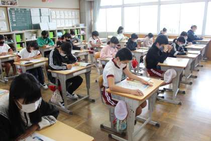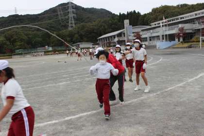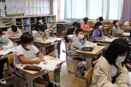 今日の様子2(10/25) 公開日 2022/10/25 更新日 2022/10/25 お知らせ 今日の各学年の授業の様子をお知らせします。あすなろ学級は、長縄跳びの練習の様子です。縄に入ることが難しいので、担任と共にタイミングを計りました計りました。 5年生は国語、6年生は外国語の授業です。運動会が近づき運動会練習が多くなる中、集中して学習しています。