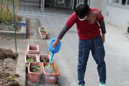 冬野菜「ラディッシュ」への水やりの様子と、自分が思い浮かべたキャラクターの絵を描いている様子です。