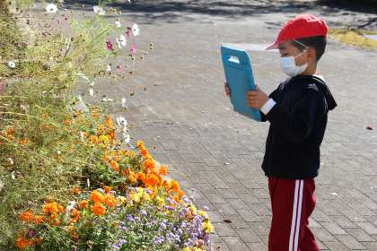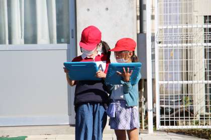 花や虫など、校庭にある自然を探し、タブレットで撮影しました。教室に戻って「発見メモ」を作るのですが、早く伝えたくて撮影後すぐに友達と見せ合っこが始まりました。