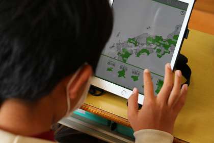 くすのき学級は社会で、都道府県パズルを担任と勝負しました。結果は、児童の勝利です!