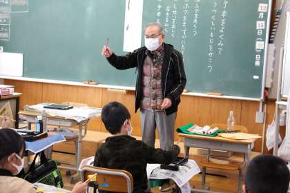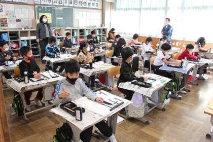 3年生の書写の様子をお知らせします。本日も書写ボランティアさんに指導を仰ぎました。一人一人に、名前の見本も書いていただき、細筆の使い方を中心に学びました。