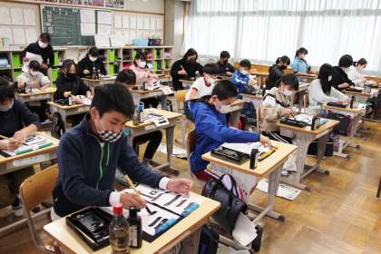 昨日の記事になりますが、6年生の書写の様子をお知らせします。書き初め大会で書く「三河の城」の字を書いています。