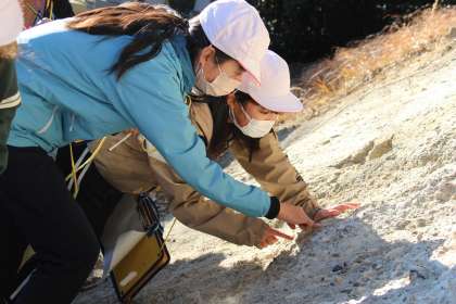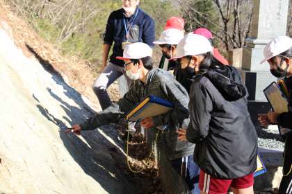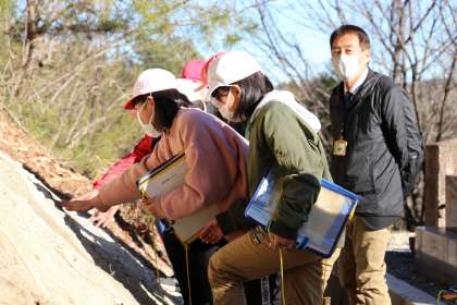 6年生石畳断層学習2 公開日 2023/01/11 更新日 2023/01/11 お知らせ 豊田市博物館に展示される断層は触ることはできないと思いますが、今日の学習では自由に触ることができ、まさに五感を使って学習しました。 本来地層は横にできるはずなのに、どうして縦に近い形なのか…。右側の石の混じった白い層と、左側の茶色っぽい岩のような砂の層はどう違うのかなど、疑問を出し合い、相談して考え、解決へのヒントをもらいながら学習しました。