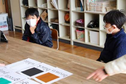 あすくす学級の授業の様子をお知らせします。外国語活動は合同で行いました。机の上に並べられた色を覚え、目隠しをした後、隠された色の名前を英語で答える問題でした。