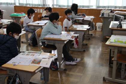 3年生の外国語活動と音楽の授業の様子をお知らせします。外国語活動は、教科書の中から、指定されたアルファベットを探している場面です。