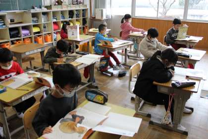 1年生の国語と生活の授業の様子をお知らせします。国語では、各自が決めたお話を読んでいる場面です。