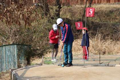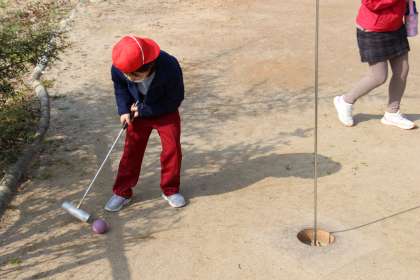 6年生児童は、これまでの経験を生かしてスムーズにラウンドしましたが、カップの位置が盛り上がっているため、ボールを打つ際、弱すぎても、強すぎても大きく離れてしまいます。そこで、少し力を入れて、カップにまっすぐ狙うことが大切と気づきました。