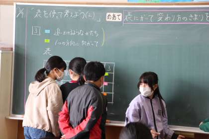 5年生の算数「表を使って考えよう」の授業の様子をお知らせします。表に書かれた数値から、決まりを見つける学習です。