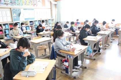 今日の各学年の授業の様子をお知らせします。4年生は算数のプリント、5年生は算数のまとめ、6年生は音楽の雅楽の学習でした。