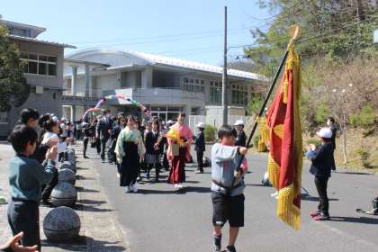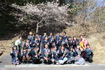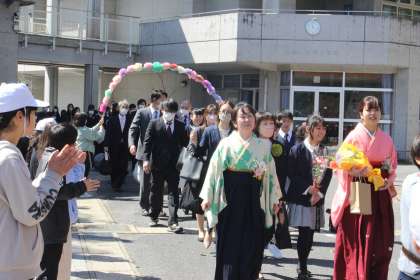 門送りの様子です。5年生の代表児童の校旗を先頭に最後の門をくぐりました。正門前の桜の下での記念撮影では、保護者カメラマンの方がたくさんいました。どこを見ていたらいいのか困った…という児童もいたようです。