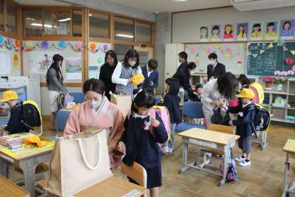 入学式2 公開日 2023/04/06 更新日 2023/04/06 お知らせ 担任の呼名に対し、元気よく返事をして「石畳小」の生活がスタートしました。学級活動では多くの配付物があり、子どもよりもお家の方の方が大変だった気がします。帰りには雨も上がり、正門の看板でも記念撮影ができました。