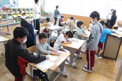 1年生が学校生活に慣れるまでの少しの間、朝の登校と同時に6年生がお世話をしてくれています。カバンの片付け方や朝の支度をはじめ、連絡帳の記入、授業準備等のフォローをしています。
