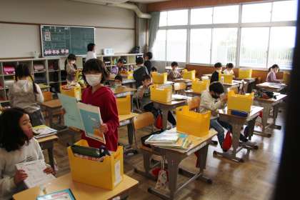 3年生の学級活動の様子をお知らせします。各授業で使う教科書やノート、資料の確認とロッカーの中のケースの中身を確認している様子です。