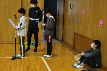 とりまとめや司会進行は6年生が行いました。はじめのあいさつの後は、2年生から歌のプレゼントです、校歌とさんぽを元気よく歌いました。1年生も、手拍子を打ちながら聴きました。