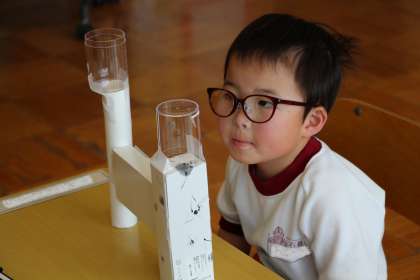 2枚目の写真は、算数「いろいろなかたち」の授業です。箱や円筒の形、透明なカップ等を組み合わせて素敵な作品を作り、学習しました。