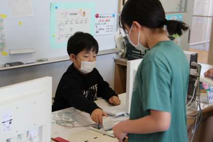 今日の様子(5/16) 公開日 2023/05/16 更新日 2023/05/16 お知らせ 今日の各学年の授業の様子をお知らせします。あすなろ学級は、朝の図書当番の様子です。CPを駆使して、貸し出し係として活動しました。 くすのき学級は、学校探検での一コマです。6年生は、算数の授業で、「分数÷整数の計算」をしました。