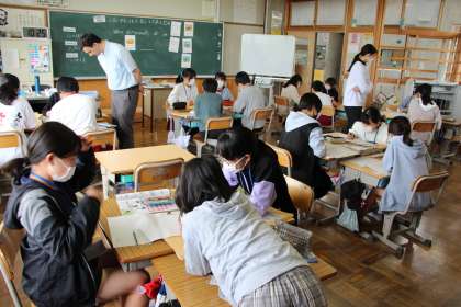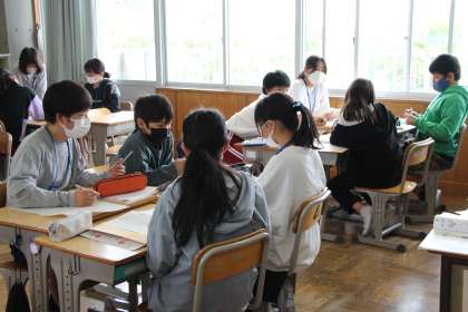 6年生の外国語の授業の様子をお知らせします。本時は、休日に何をしているかのインタビューをしました。土曜の朝、日曜の夜など、いつの行動を聴くのかをワークシートに記入し、インタビューし合いました。