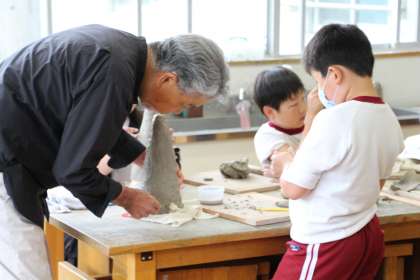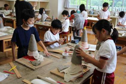 4年生陶芸作品づくり 公開日 2023/05/29 更新日 2023/05/29 お知らせ 4年生の陶芸作品は「ランプシェード」です。基本の円錐状の形にパーツをつけ足したり、繰りぬいたりしながら、オリジナルランプシェードを作成しました。作成に当たっては、担任や子どもたちだけでは難しい点があるので、地域講師(共働本部コーディネーターのお二人)にもご来校いただき、アドバイスをもらいながら進めています。