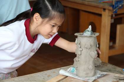 1年生の陶芸作品づくりの様子をお知らせします。1年生のテーマは「花瓶」です。ねんどを平らに伸ばした後、円柱状に整形し、模様や飾りをつけてオリジナリティーを出しました。