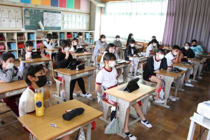 6年生の授業の様子をお知らせします。1枚目の写真は、基礎学力テストをお伝えする予定でしたが、私が訪問した時にはほとんどの子がテストを終え、タブレット学習に入っていました。