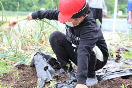 あすくす学級の授業の様子をお知らせします。本日は、あすくす学級で玉ねぎの収穫を行いました。山ほどの玉ねぎが取れたので、朝市での販売に向けての準備が始まります。