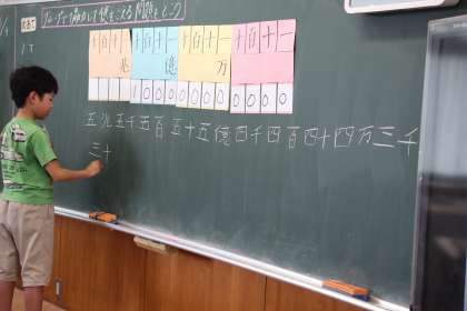 4年生の授業参観の様子をお知らせします。4年生は算数「一億を超える数」をクイズ形式にして、グループ対抗クイズ大会を行いました。