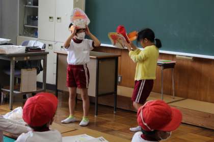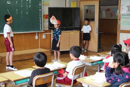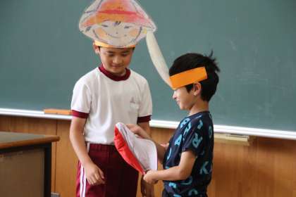 2年生国語 公開日 2023/06/15 更新日 2023/06/15 お知らせ 2年生の国語「名前を見てちょうだい」の授業の様子をお知らせします。昨日は、役割演技を見逃しましたが、本時は演技中に訪問することができました。えっちゃん役、きつね役、ナレーター、風役の黒子に分かれて行いました。