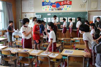 外国語は、将来なりたい職業をテーマに、職業名が書かれたカードを使って学びました。これまでも曜日などで同じようなゲームを行いましたが、今回は「職業名」なので、カードを読むのがやっと、実は難しくて読めない、わからない状態の子もいたかも知れません。こんな時こそ、楽しく学ぶことが肝心ですね!