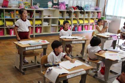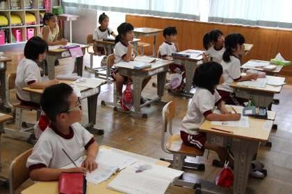1年生の授業 公開日 2023/06/21 更新日 2023/06/21 お知らせ 1年生の国語と音楽の授業の様子をお知らせします。国語は、大人でも間違えやすい「う」と「お」の使い分けの学習でした。おと〇さん、こ〇り、そ〇じ、お〇かみには、どちらが入るのかについて学びました。 音楽は、カスタネットの学習です。音楽室でムカデが出たため、安全第一を考え、急遽教室に移動して行いました。