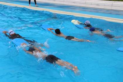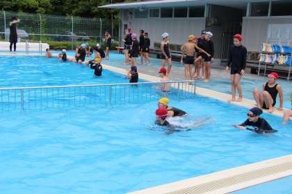 本時は、初級班は、ドルフィンキックから水にスムーズに乗れる練習、中級班は、け伸びからバタ足を使っての泳ぎや、ビート板を使って足の蹴りの練習、上級班は、フォームを意識して速く泳ぐ練習でした。