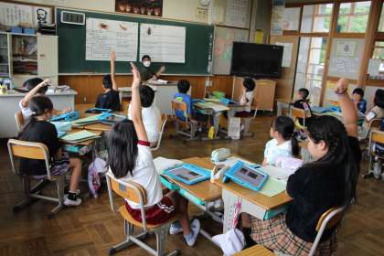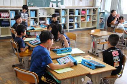 4年生の総合「川の生き物」の授業の様子をお知らせします。川遊びで捕った生き物などを調べ、まとめに入っています。