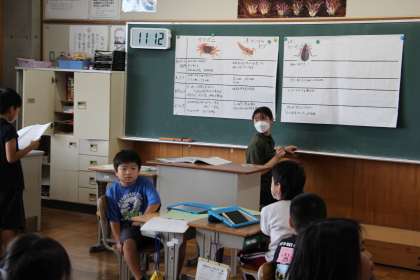 サワガニやオニヤンマのヤゴなど、調べた内容を発表しながらまとめをしました。