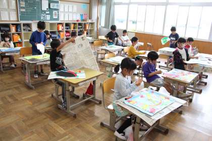 2年生の算数と図工の授業の様子をお知らせします。図工は「ふしぎなたまご」を作成しています。