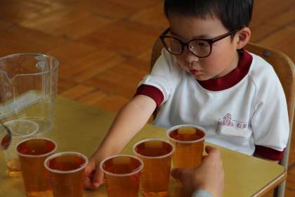 くすのき学級の算数「かさくらべ」の授業の様子をお知らせします。いろいろな容器に入る水(お茶)の量を、コップを使って比べました。